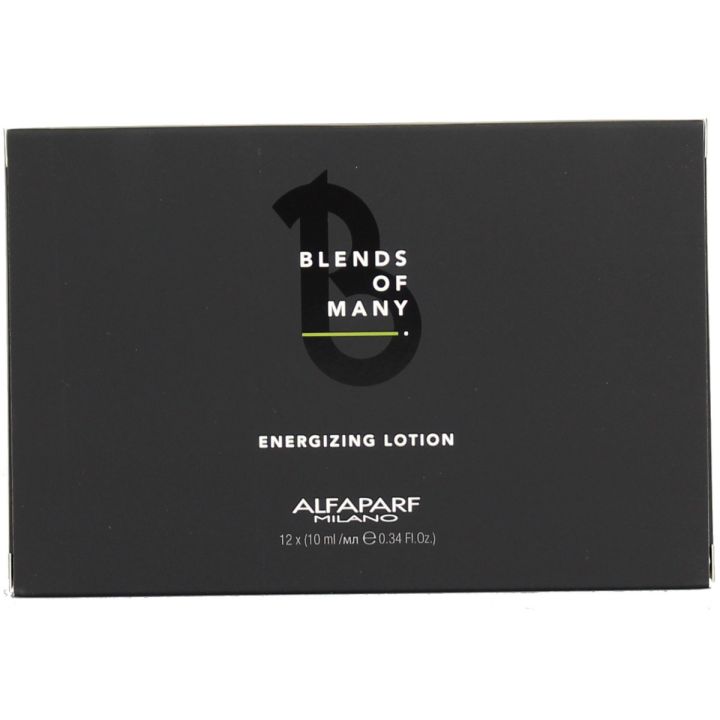 Alfaparf Blends Of Many - Energizing Lotion 12 x 10 ml is an Intesive treatment for weakened hair, encourages hair growth and stimulates thickness and volume. The Alfaparf Blends Of Many Energizing Lotion 12x10 ml is an intensive treatment for weakened hair. The energizing lotion encourages hair growth, stimulates thickness and volume. Enriched with: Urban Defense Pro: this technology is designed to protect the hair from the harmful effects of pollution, prevents dust and heavy metals from entering the hair and causing the production of free radicals. Black tea, a natural active ingredient with 3 fundamental benefits: antioxidant soothes irritated skin, stimulates microcirculation and follicle activity of the skin. Energizes hair, leaving it soft and shiny. Biopower strength: treats hair loss, strengthens hair follicles.
