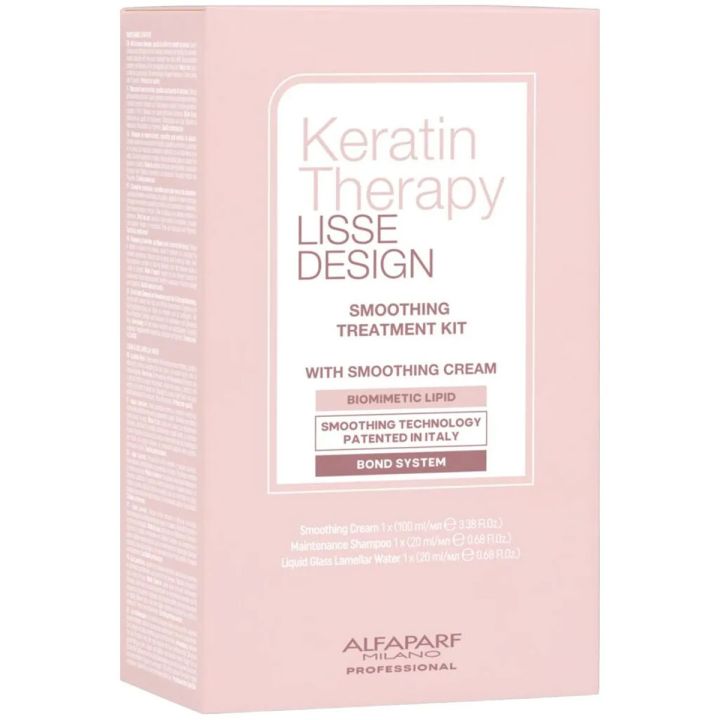 Alfaparf Lisse Design - Keratin Therapy Express Intro Kit contains three products from the Lisse Design line: the Deep Cleansing Shampoo, the Smoothing Fluid and the Rehydrating Mask.