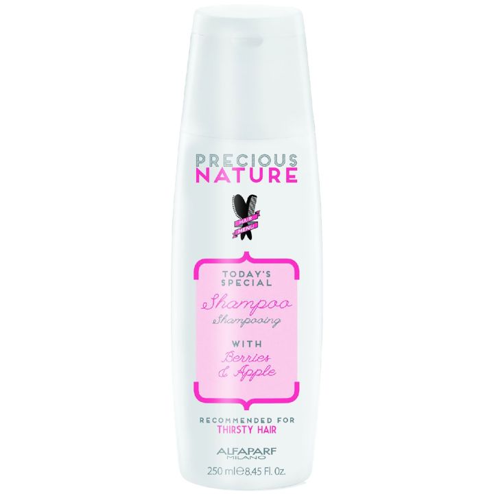 Alfaparf Precious Nature - Dry & Thirsty Hair Shampoo is specially formulated for dry hair that often feels rough and lacks shine. Thanks to its lightweight formula, it does not weigh hair down. The exceptional 100% natural formulation contains fruit extracts that give the hair a fresh scent. It contains natural berry extracts, rich in antioxidants, which neutralize free radicals and make the hair more resistant to external factors. Apple extract supports adequate hydration levels.
