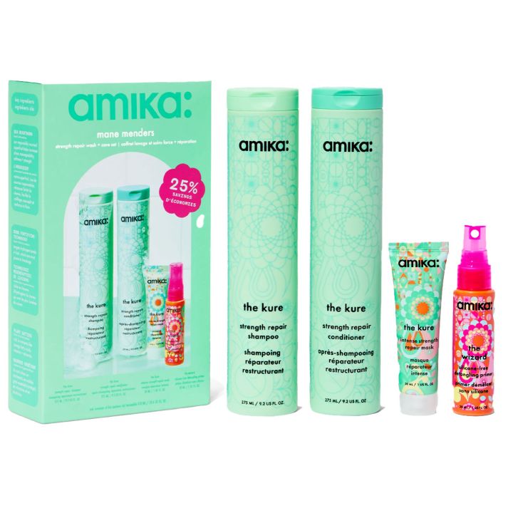 Amika -Mane Menders Strength Repair Wash + Care Set contains four powerful products that work together to repair, strengthen and care for damaged hair. These full-size and travel versions include the Kure Strength Repair Shampoo, Conditioner, Intense Strength Repair Mask and The Wizard Silicone-Free Detangling Primer. Formulated with bond-fortifying technology and nourishing oils (such as sea apple, borage, avocado and mango), this routine helps reduce hair breakage and strengthen the hair shaft - for shiny, strong and healthy hair.