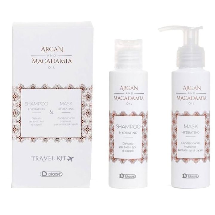 The Biacre Argan and Macadamia Oil Travel Kit contains Hydrating Shampoo 100ml and a Hydrating Mask 100ml. These products work together and are tailored to optimize hair nourishment and care. The shampoo deeply cleanses the hair and the hair mask hydrates the hair and penetrates deep into the hair root. The combination of Argan, Macadamia, Almond and Coconut oils makes the hair intensely nourished as a result. Dry and porous hair absorbs the oils extra well, giving them the chance to repair the hair from within.