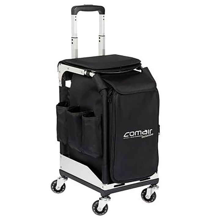 Multifunctional seat and tool case, extendable and in 3 heights adjustable telescopic handle, practical carrying handle, 4 rubber wheels for comfortable use, comfortable padded seat surface, frame made of aluminum covered with sturdy fabric, spacious and removable storage compartments and several practical storage bags.