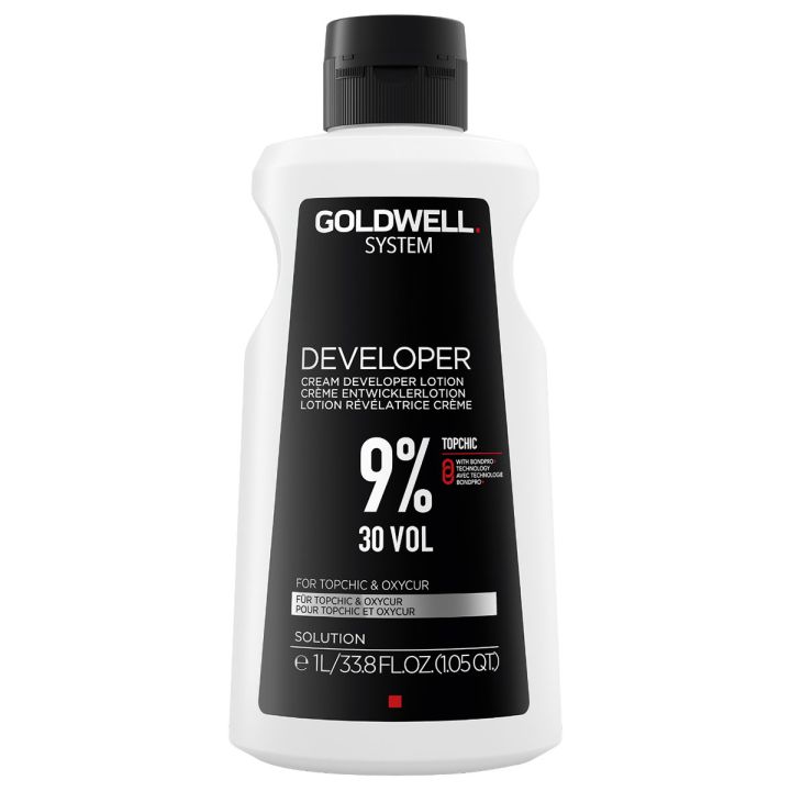 Goldwell Topchic Developer Lotion 9% (30 Vol) 1000 ml is a professional oxidation cream specially developed for use with Goldwell Topchic permanent hair color and Oxycur Platin blonde products. This formula provides powerful and even color results with beautiful shine and prevents unnecessary hair damage thanks to BondPro+ technology.