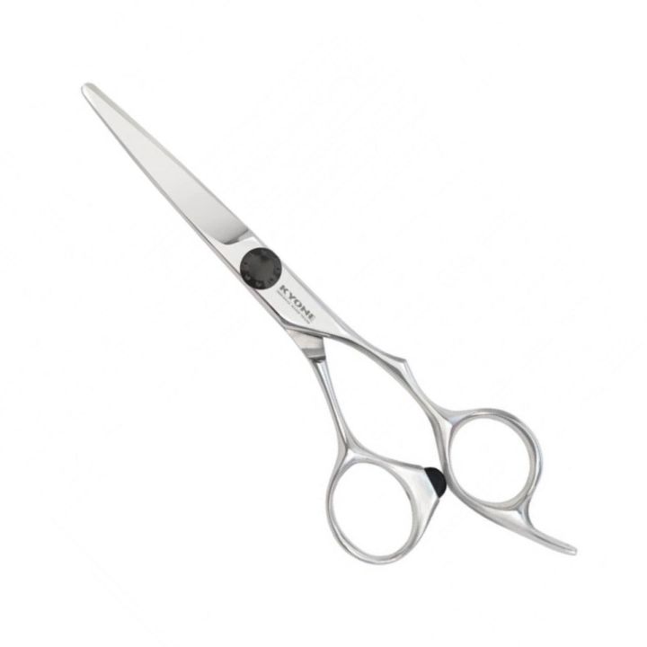 Handmade hairdressing scissors with ergonomic design, model 710 from Kyone. The ergonomic design ensures effortless and comfortable cutting all day long. These hairdressing scissors have a ball bearing screw. The screw reduces resistance while cutting. The smooth barrel minimizes the strain on your hand and wrist.