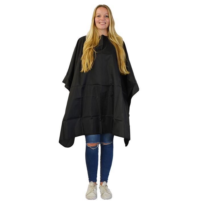 Nebur Cap coat Basic Black with button closure. Size is 141 x 134 cm. 100% woven nylon. Breathable and water repellent.