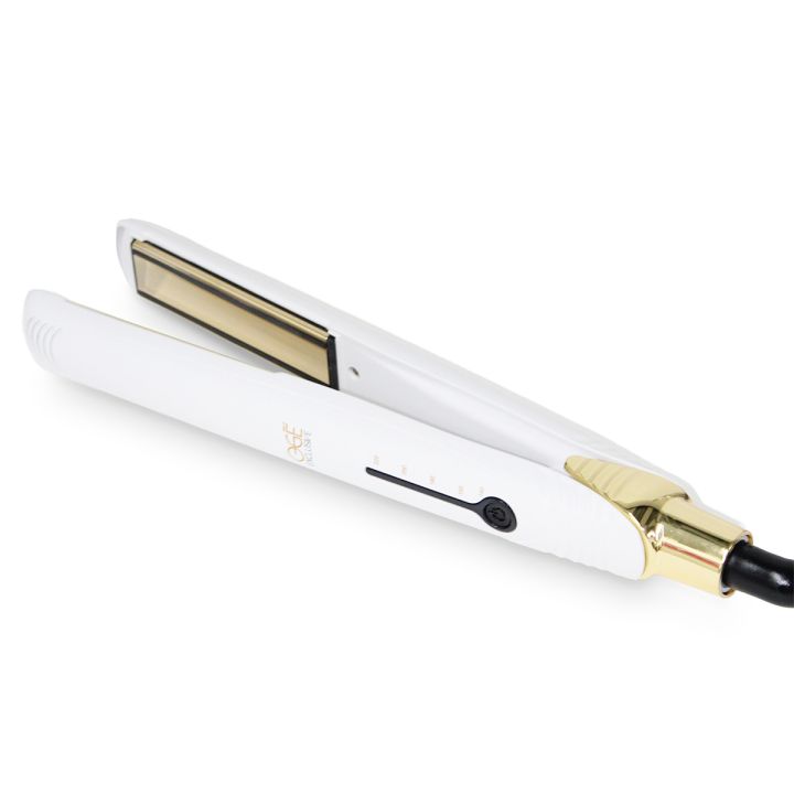 The Ogé Exclusive Hair Straightener One Touch Stripes is at 220 degrees in 10 seconds. The degrees are digitally adjustable. The plates are flexible and curling is also possible with this straightener. An extra long cord ensures comfort while using it, never again searching for an outlet near the mirror!