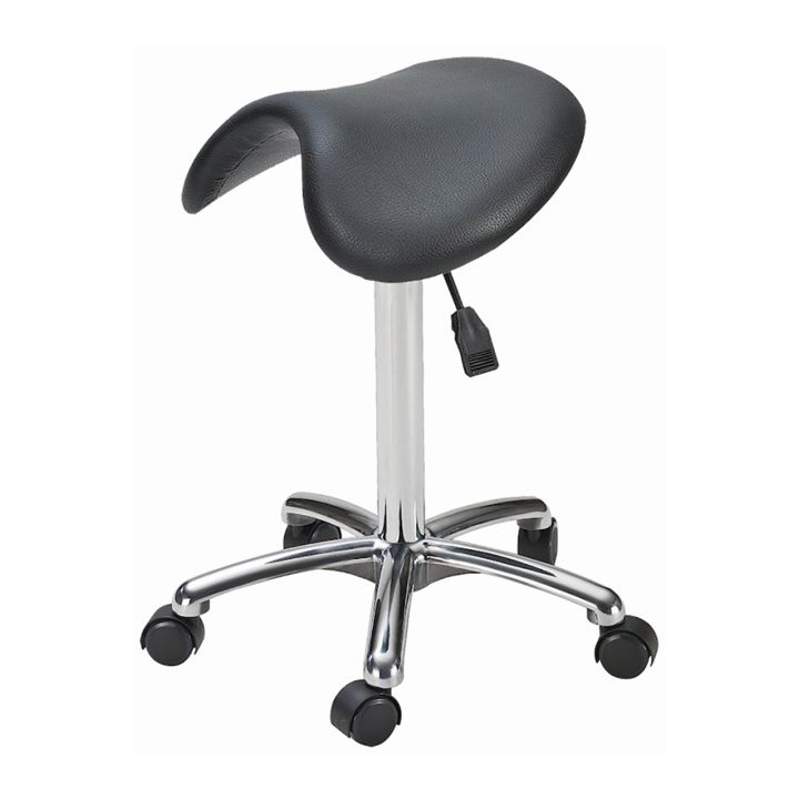 Looking for an ergonomic barber's stool? This black Saddle Barber Bike is a saddle roll stool, adjustable in height. The base of this barber's stool is chrome-plated.