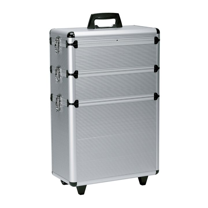 Thanks to the extendable handle, this aluminum case 65X43X22 cm also allows itself to be used perfectly as a trolley. Heavy materials such as liter bottles of shampoo and permanent liquid are no longer a problem.